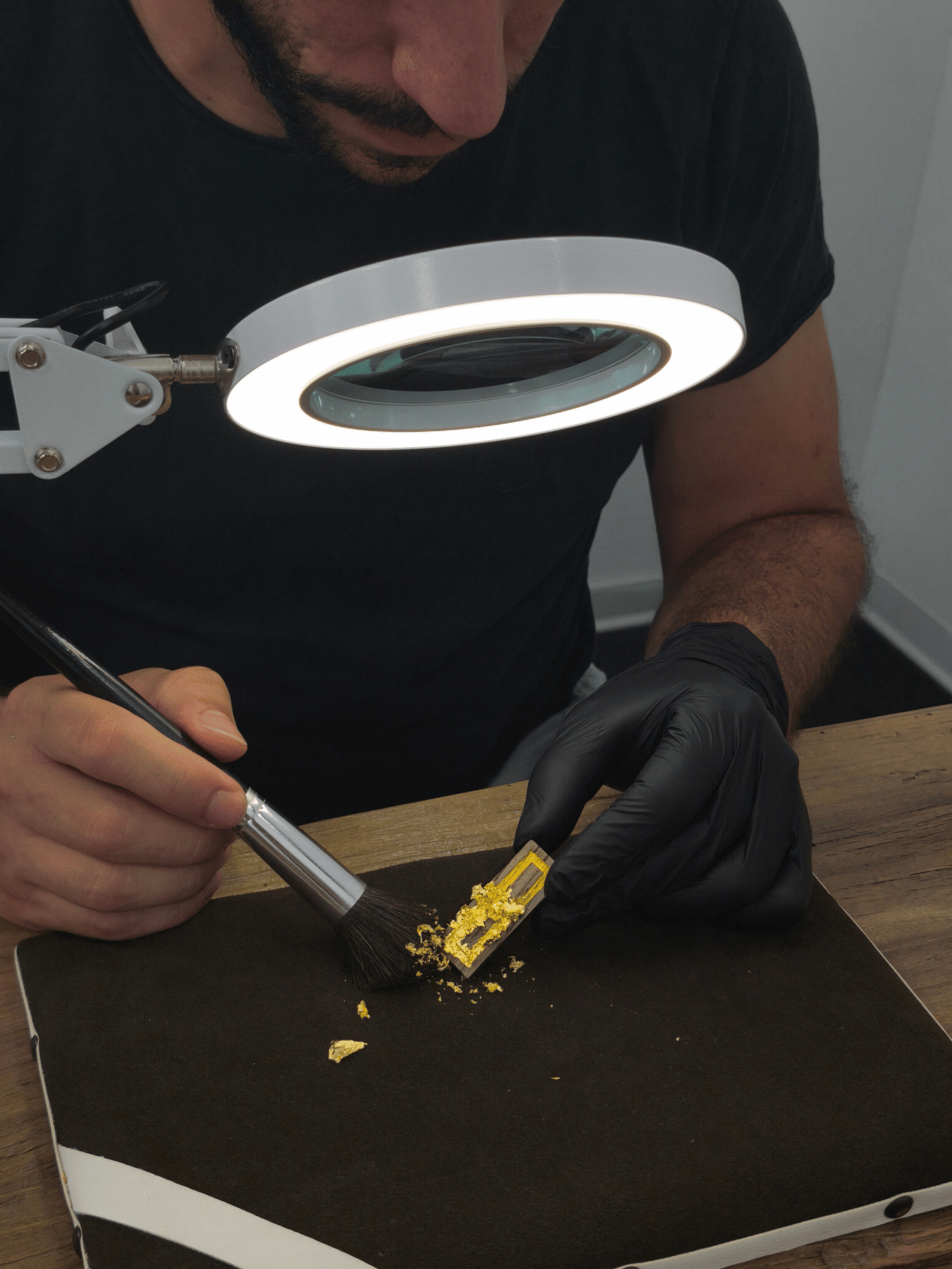 La stesura della foglia oro è una delle fasi più delicate di tutto il processo.